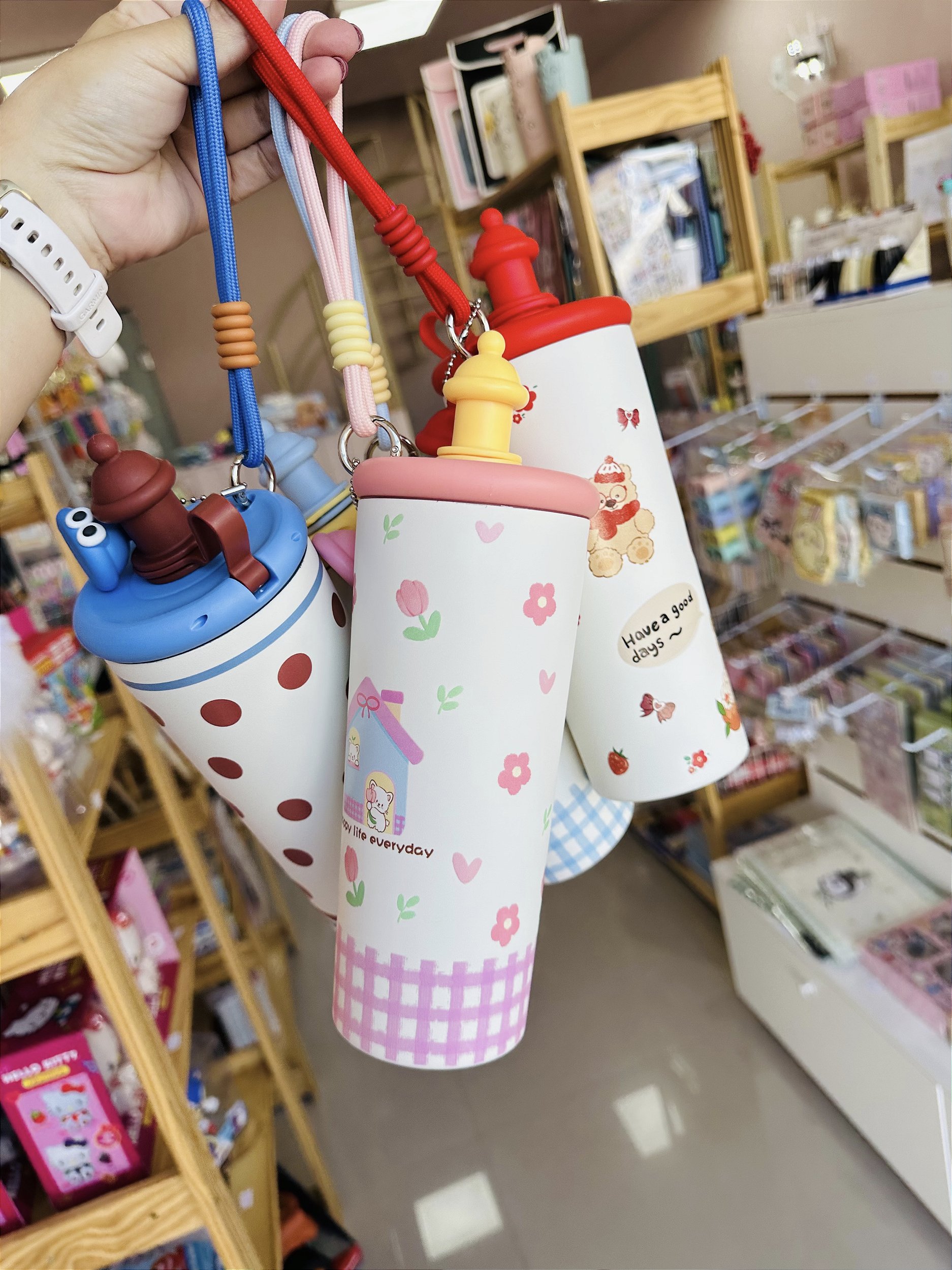 Com estampas delicadas, cores suaves e personagens adoráveis, ele acompanha um cordão lateral com pingente decorativo, que deixa o visual ainda mais divertido e único. A tampa com bico ajuda a evitar vazamentos, tornando o copo ideal para o dia a dia, passeios, escola ou momentos especiais.