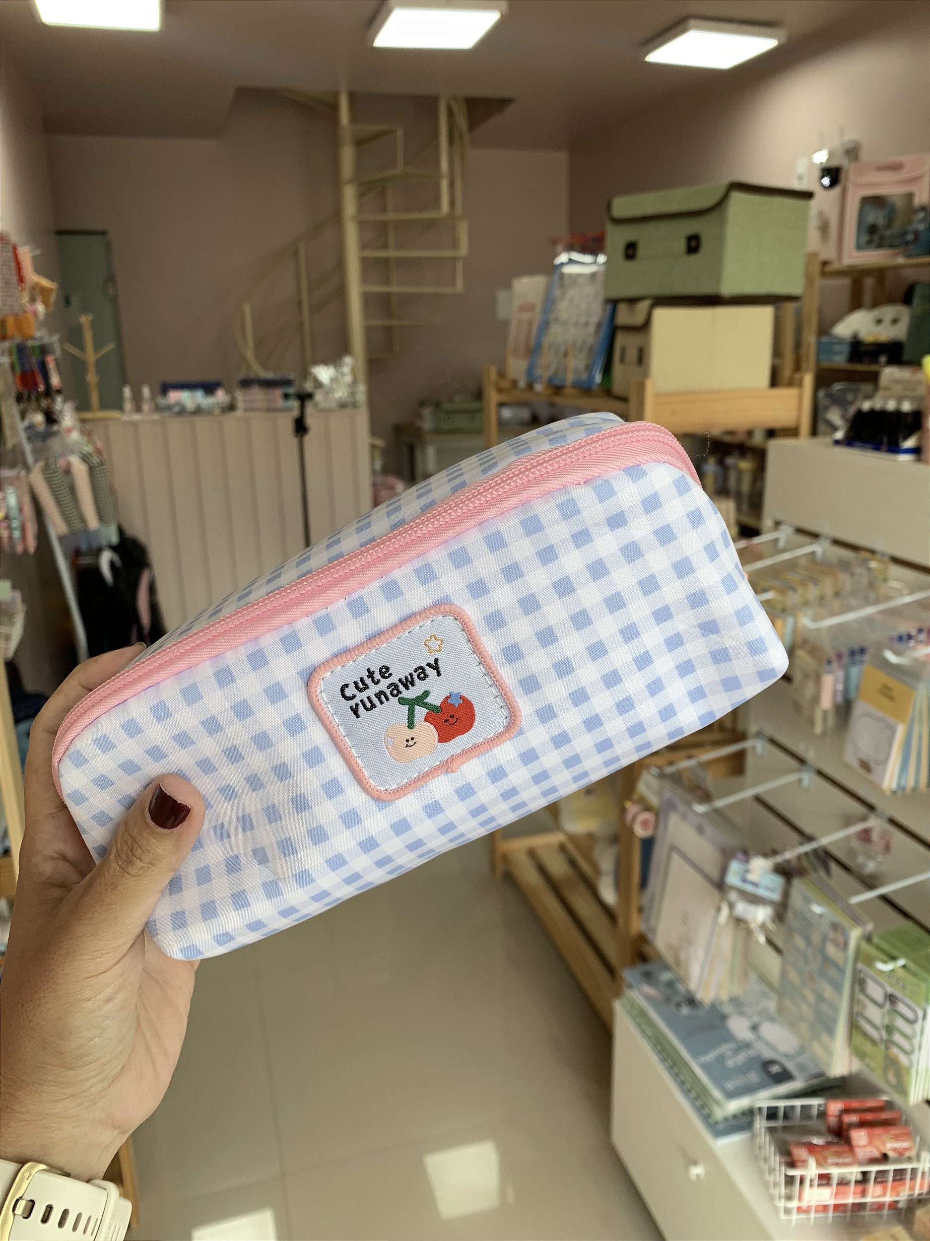 •Design Encantador: Com uma estampa xadrez clássica em tons pastéis e um patch bordado super fofo de cereja, ele une a estética aesthetic com a funcionalidade do dia a dia.