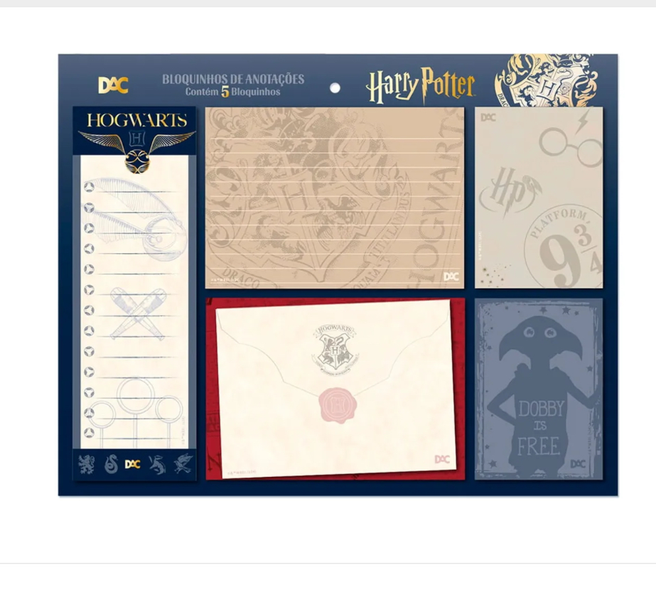 O Bloco de Anotações Harry Potter - 5 Tamanhos é perfeito para trazer a magia de Hogwarts à sua organização diária. Com uma bandeja que inclui 5 bloquinhos em diferentes tamanhos, cada um com design exclusivo inspirado no universo de Harry Potter, ele é ideal para listas, lembretes ou notas rápidas. As folhas são feitas em papel offset 90g, garantindo maior espessura e evitando que a tinta de canetas esferográficas ou hidrográficas vaze para o outro lado, proporcionando uma escrita mais confortável.