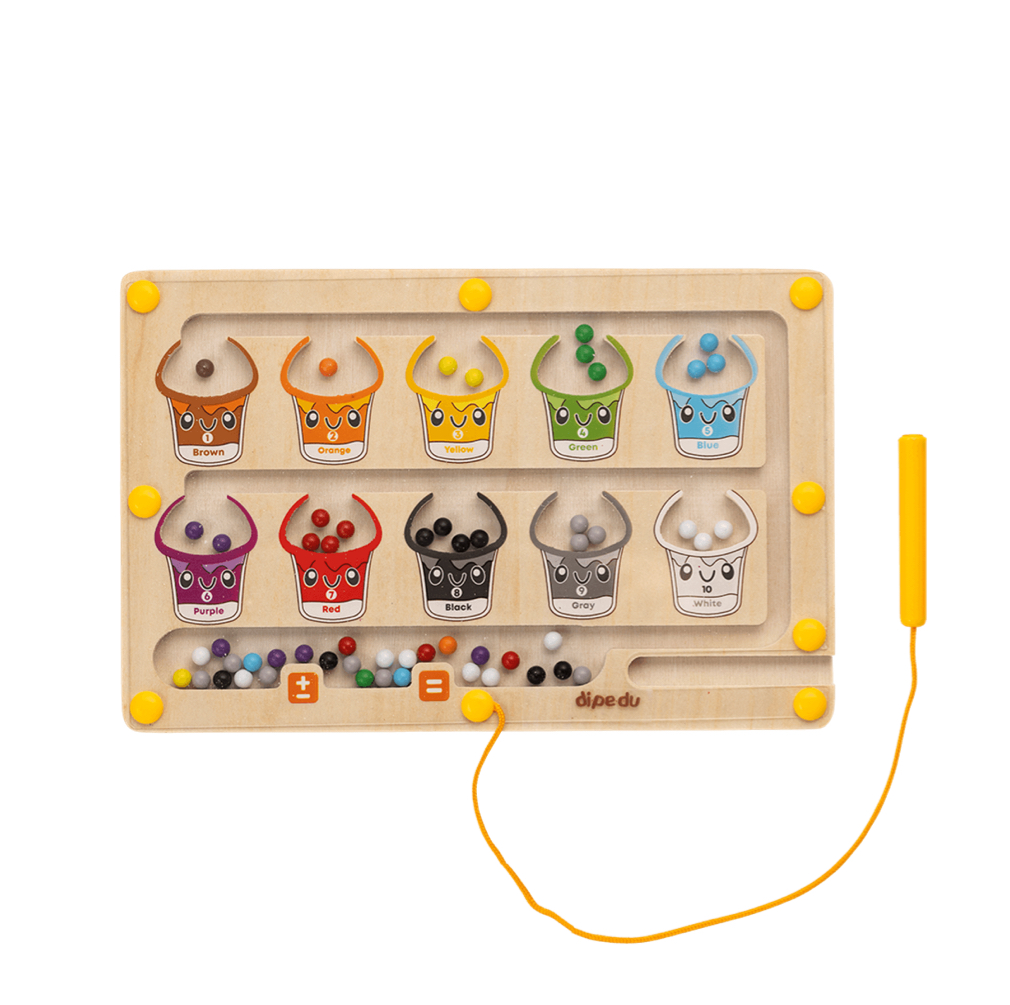 Com o auxílio da caneta magnética, a criança guia as bolinhas coloridas pelos caminhos do tabuleiro, levando-as até os potinhos correspondentes às cores.